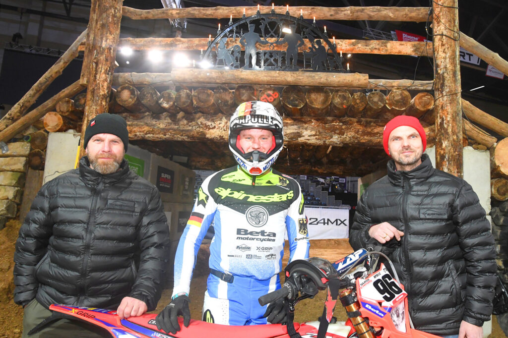 Die Wahl für die offizielle Streckenvorstellung fiel mal wieder auf Tim Apolle, einem von zwei deutschen Piloten (neben Manuel Lettenbichler) in der Top-Klasse Prestige. Nach seinen ersten Metern auf dem schon optisch spektakulär aussehenden Track meinte der 29-jährige Lokalmatador aus Finne OT Billroda im Süden Sachsen-Anhalts: „Die Strecke ist schwerer als letztes Jahr, besonders der Außenring hat es in sich. Da sind viele anspruchsvolle Hindernisse wie das Steinfeld, die Baumstämme-Kurve sowie der neue Abschnitt mit den V- bzw. A-förmig angeordneten Sprunghügeln. Auch die Steilauffahrt über die klassische Riesa-Brücke ist wieder dabei. Das alles hat es erneut in sich. Die vielen Sandpassagen machen das Ganze noch ein bisschen anspruchsvoller. Ich denke, dass es wieder eine geile Strecke geworden ist, auf der, im Vergleich zum letzten Jahr, noch einiges raus gekitzelt wurde.“